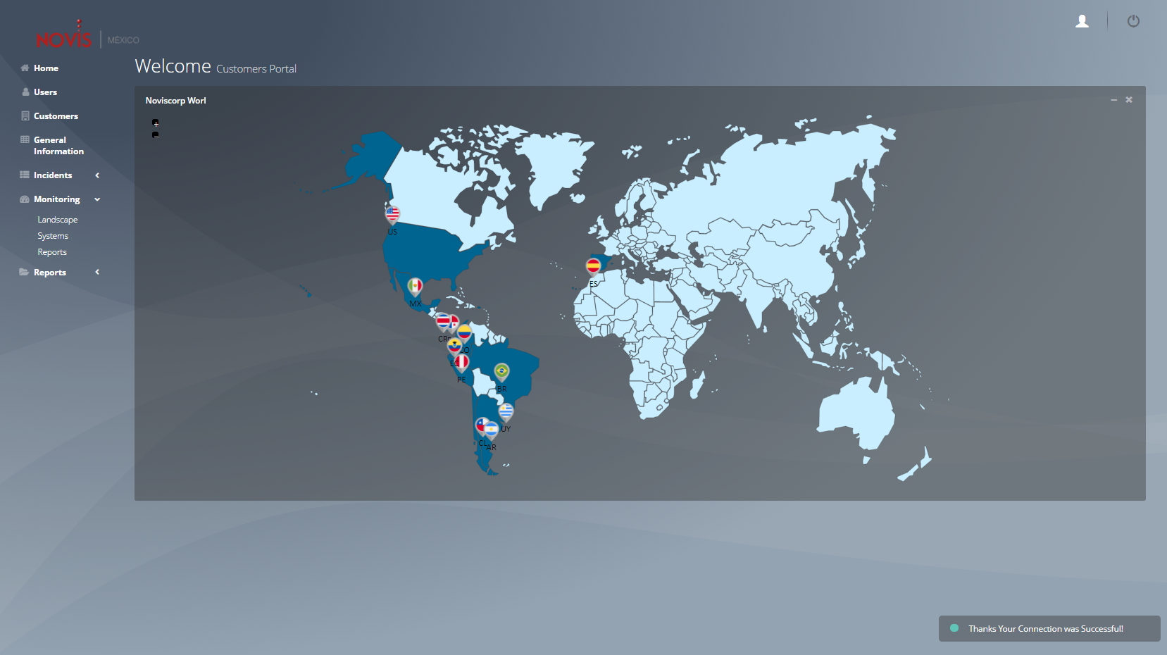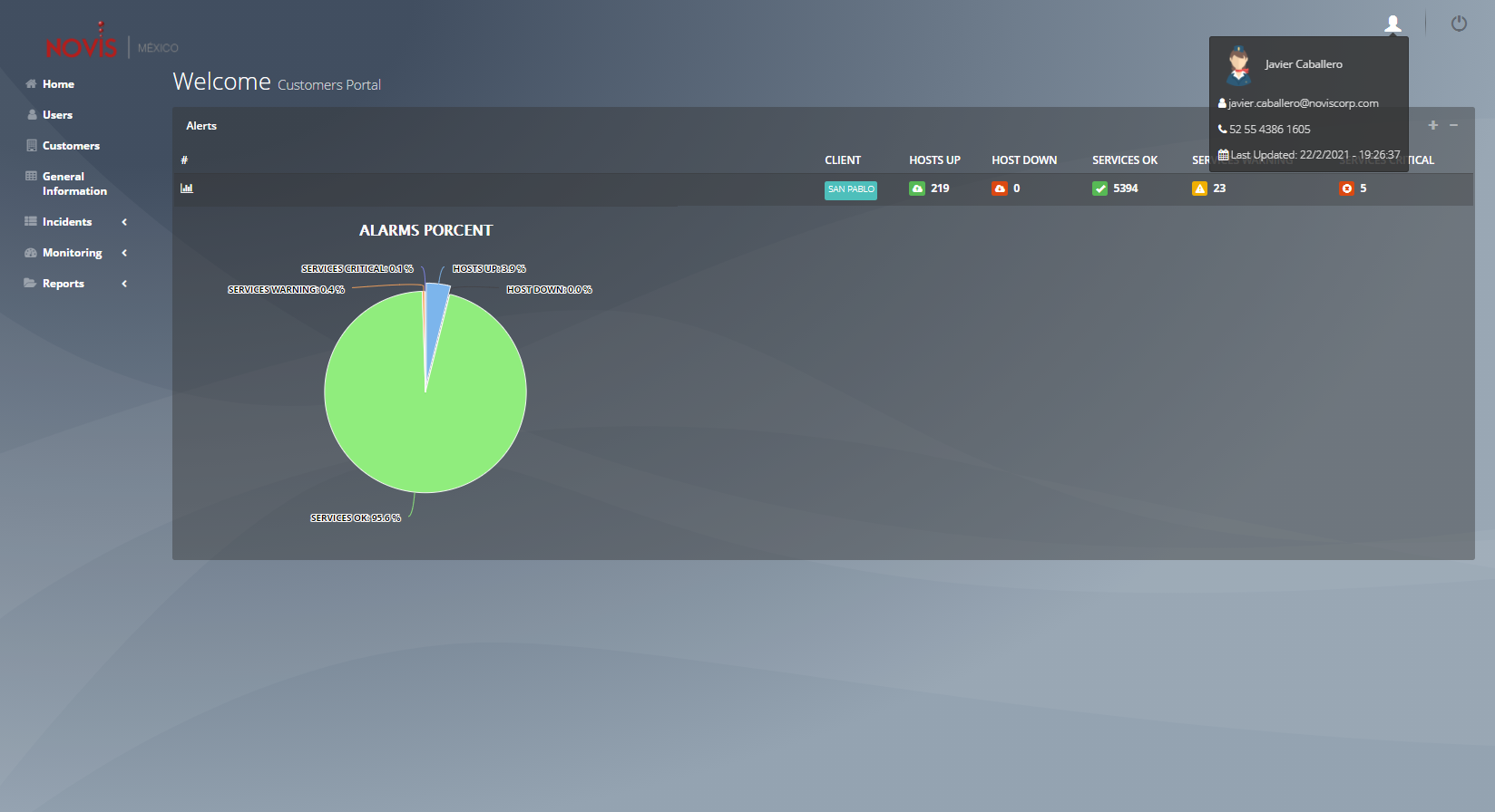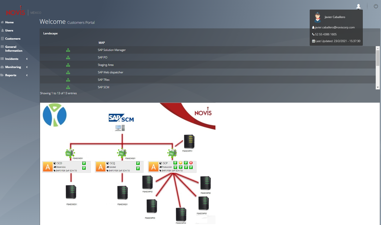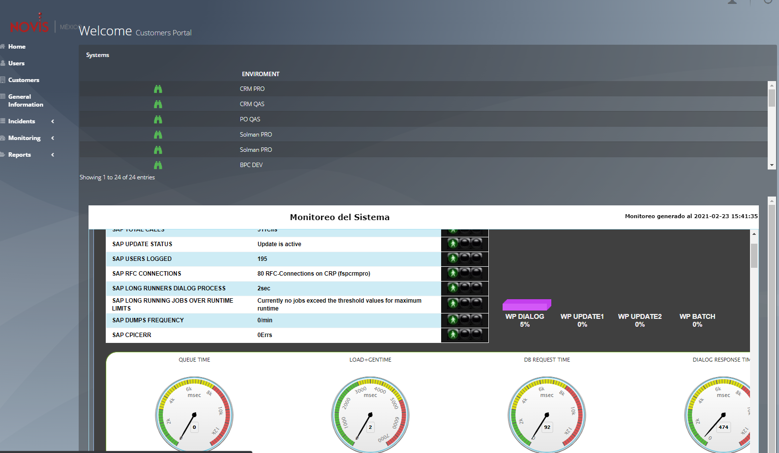 Es un sistema, en el cual pueden acceder clientes para poder visualizar reportes de manera gráfica de sus servidores virtuales, el estatus en el que se encuentra cada uno de sus host, bases de datos o sistemas SAP (Desarrollo, Calidad y Producción). Muestra tambien Información de monitoreo en tiempo real en un DASHBOARD de cada sistema, con el que cuenta el cliente. de igual forma este portal cuenta con una parte administradora para que el usuario admin pueda dar de alta clientes, roles, mapas, roles y poder asignarlos desde una interfaz gráfica.